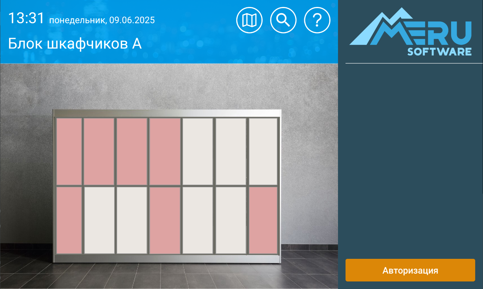 В верхней части приложения расположена кнопка с иконкой в виде карты. Нажав кнопку, вы сможете найти все блоки шкафчиков на этаже.