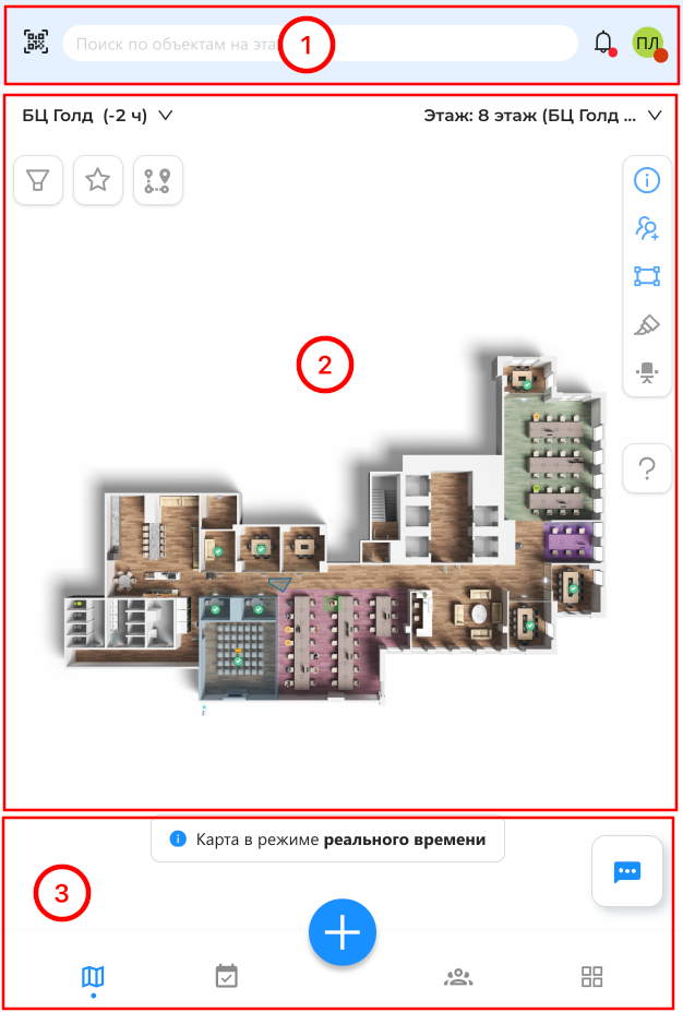Главный экран приложения Merusoft Smart Office представляет собой интерфейс, через который пользователи могут взаимодействовать с системой управления офисным пространством.