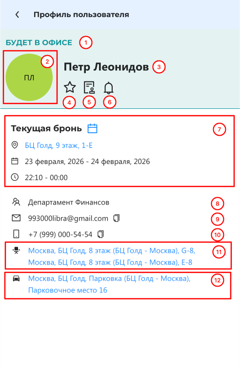 Закрепленные за пользователем парковочные места (при наличии). При нажатии будет выполнен переход к объекту на карте с подсветкой красным маячком и последующим открытием карточки рабочего или парковочного места.