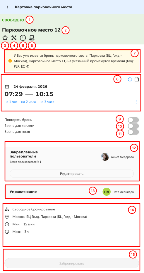 Блок отображает администраторов с расширенными правами для управления бронями на этом объекте. - Параметры парковочного места: