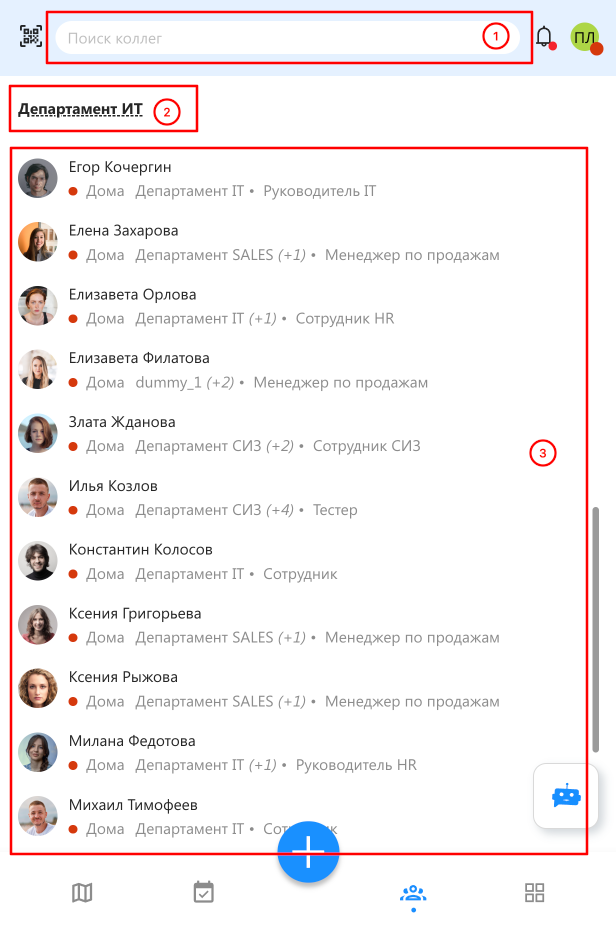 В основной области отображения виджета содержится список пользователей, принадлежащие выбранному отделу. Для каждого пользователя отображается:- Фотография
