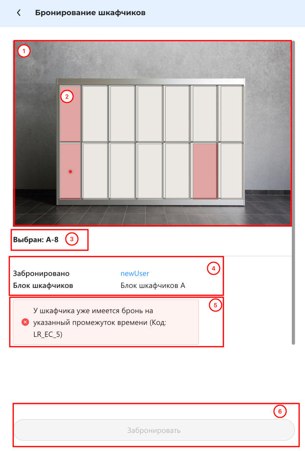 Карточка блока шкафчиков (бронирование шкафчиков) состоит из следующих элементов: