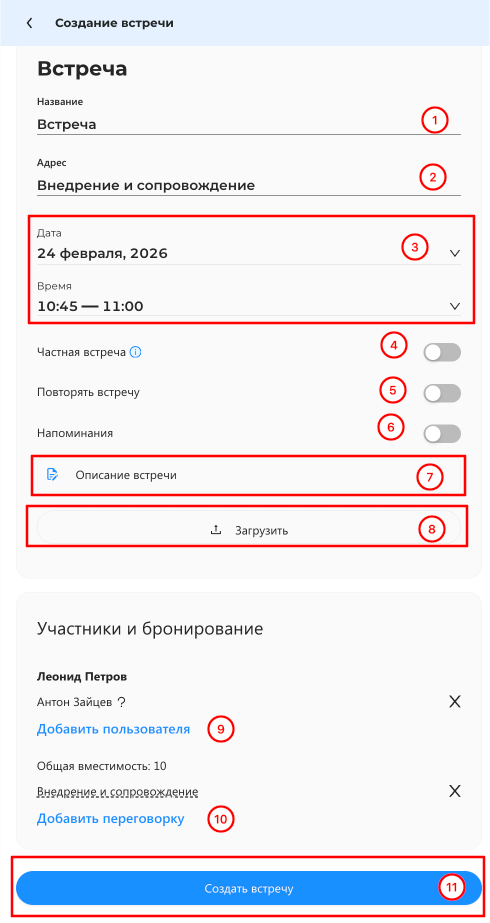 Адрес встречи – заполняется автоматически из наименования добавленной переговорной. Может быть введено вручную. Значение будет использовано в календарях всех участников встречи и в уведомлениях о приглашении на встречу.