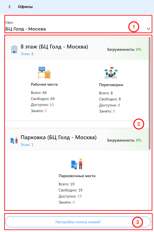 В основной области отображаются список офисов с подробной информацией о загруженности. Отображаются данные о количестве рабочих мест, переговорных комнатах и парковочных мест, а также их статусе (свободно, занято доступно). Для каждого объекта указана информация о загруженности в процентах. - Настройка списка этажей