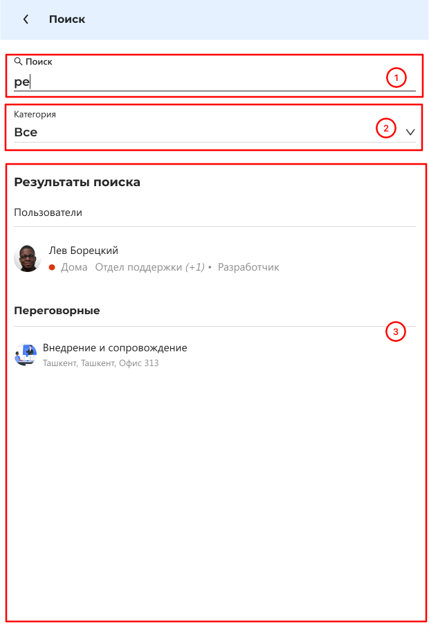 - Переговорные – фильтр по переговорным комнатам.