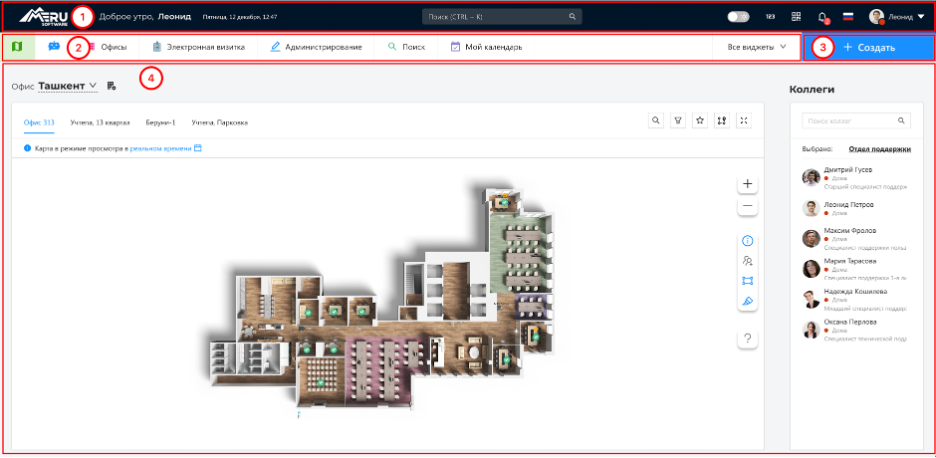 Поиск – поиск производится по частичному совпадению в наименовании искомого объекта (для пользователей – поиск осуществляется в т.ч. по почте и телефону). Поиск осуществляется по пользователям, рабочим местам, парковочным местам, переговорным комнатам, блокам шкафчиков, точкам интереса.