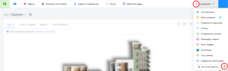 Панель виджетов. Панель виджетов состоит из видимых, скрытых (объединенных в меню) и отключенных виджетов. Распределение виджетов осуществляется в окне «Настройка отображения виджетов»(Рис. 5), которое вызывается кнопкой «Настроить виджеты» (Рис. 4-2). Для изменения порядка виджетов перетащите их. Виджеты, отмеченные символом в виде закладки нельзя изменить.
