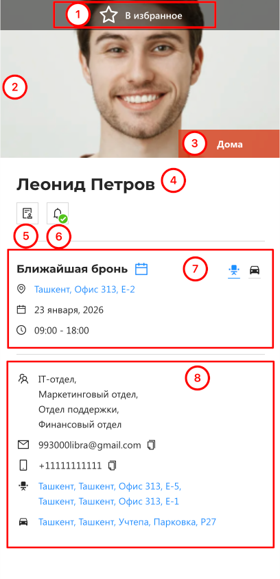 Закрепленные за пользователем рабочие и парковочные места (при наличии). При нажатии будет выполнен переход к объекту на карте с подсветкой красным маячком и последующим открытием карточки рабочего или парковочного места.
