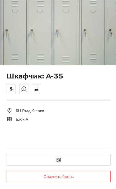 • Если права на доступ к блокам шкафчиков присутствуют и имеются действующие брони шкафчиков, то отображается информация о текущем бронировании (наименование шкафчика, место и блок шкафчика) и кнопки действия:
