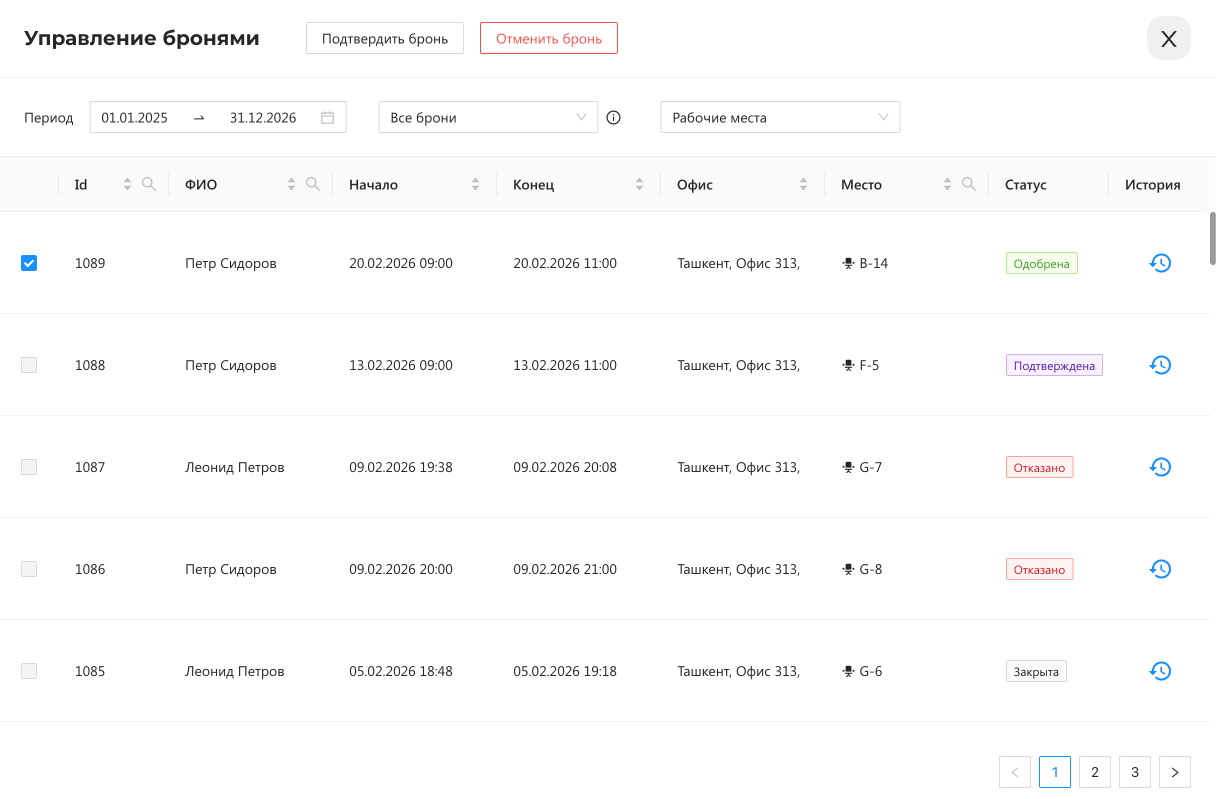 - История. Примечание: колонка недоступна для типа объекта "Шкафчики". Кнопка, открывающая окно "История бронирования". В этом окне отображается история изменений статусов выбранной брони с датой и временем изменения, а также пользователями, которые внесли эти изменения.