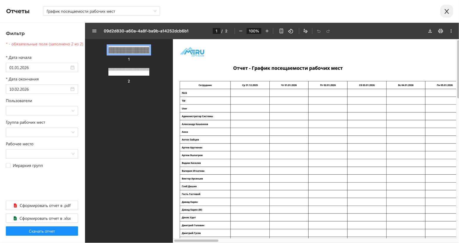 - Сформировать отчет в .pdf - формирует отчет в формате PDF.