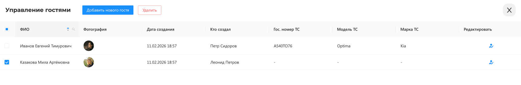 Виджет «Управление гостями» предназначен для просмотра и администрирования информации о добавленных гостях. Виджет позволяет добавлять, редактировать и удалять гостей.