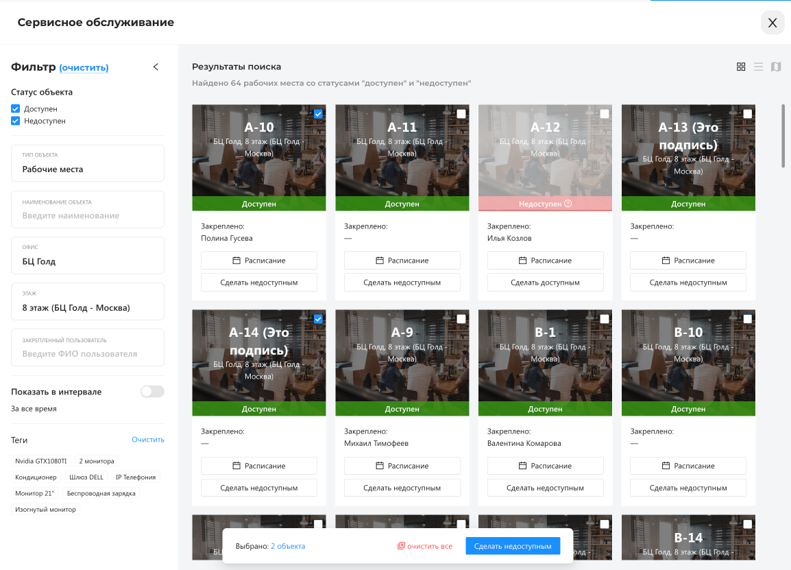 Виджет «Сервисное обслуживание» предназначен для централизованного управления доступностью ресурсов офисного пространства: рабочих мест, переговорных комнат, парковок и шкафчиков. Он используется для временного вывода объектов из эксплуатации (например, для уборки, ремонта или технического обслуживания), чтобы сотрудники видели актуальный статус и не планировали использование недоступных объектов.