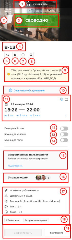 Редактировать. Только для статуса «Ожидает check-in»: позволяет изменить рабочее место, дату и время брони.