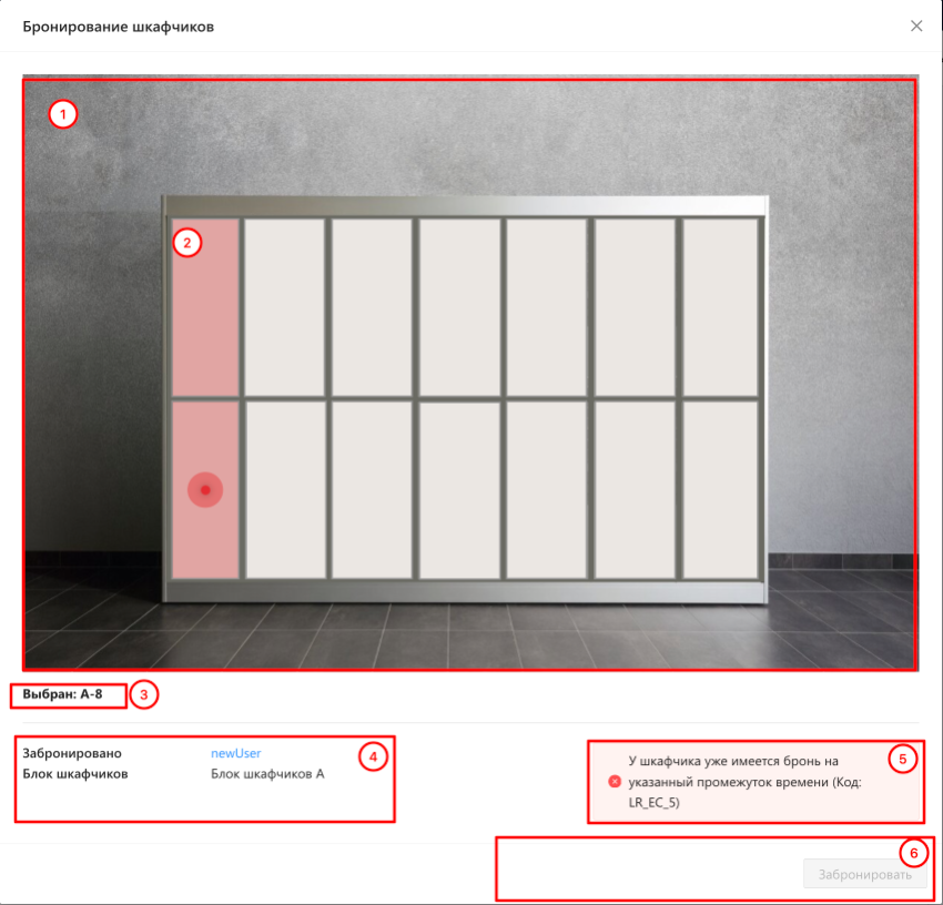 Карточка блока шкафчиков (бронирование шкафчиков) состоит из следующих элементов: