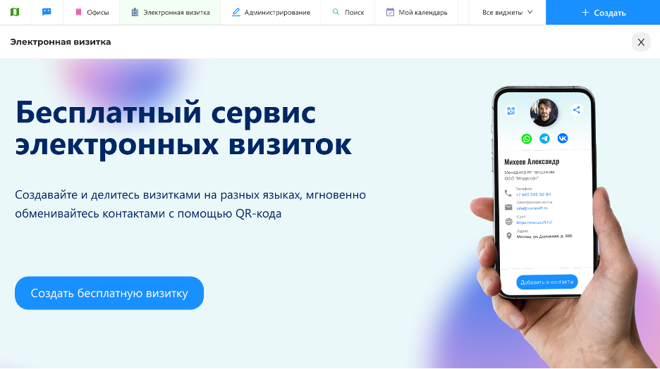 Виджет «Электронная визитка». Модуль предназначен для создания и обмена цифровыми визитками, привязанными к профилю сотрудника. Визиткой можно делиться через QR-код или ссылку в мессенджерах и по электронной почте, быстро передавая актуальные контактные данные, в том числе на разных языках, с возможностью сохранить контакт напрямую в телефонную книгу устройства. Сервис упрощает нетворкинг, использование визиток на мероприятиях и внутреннее взаимодействие в компании, а также может применяться как корпоративный справочник.